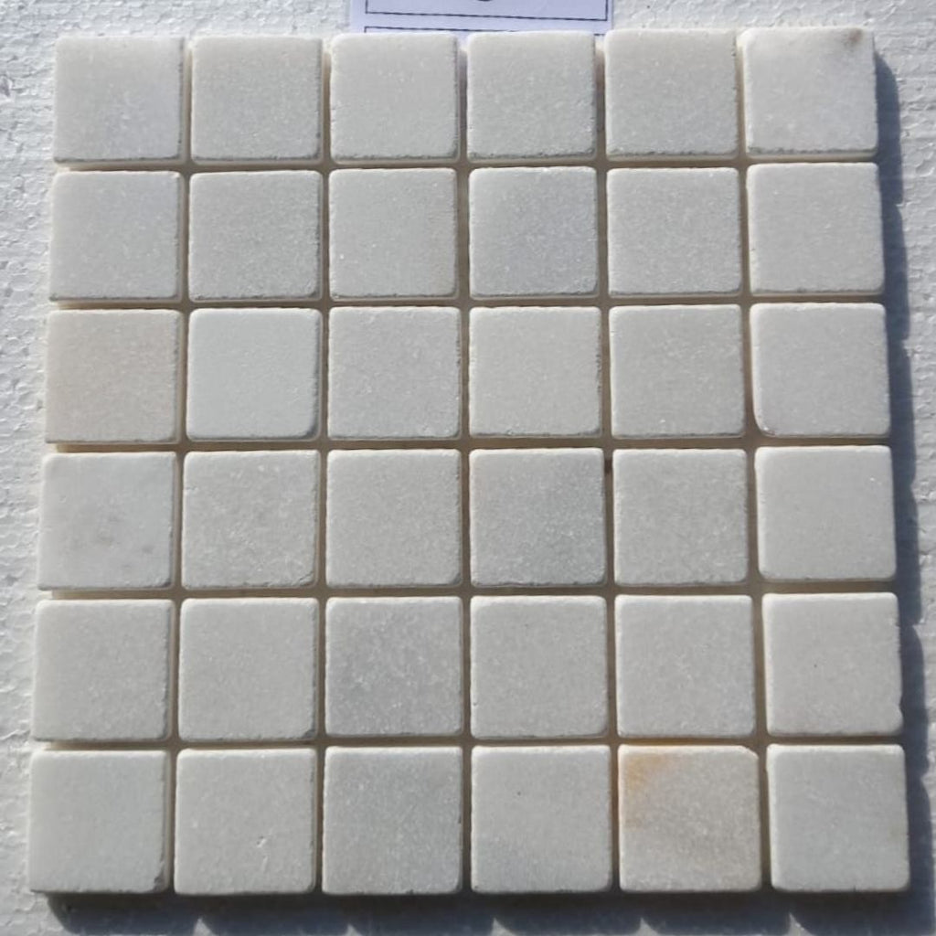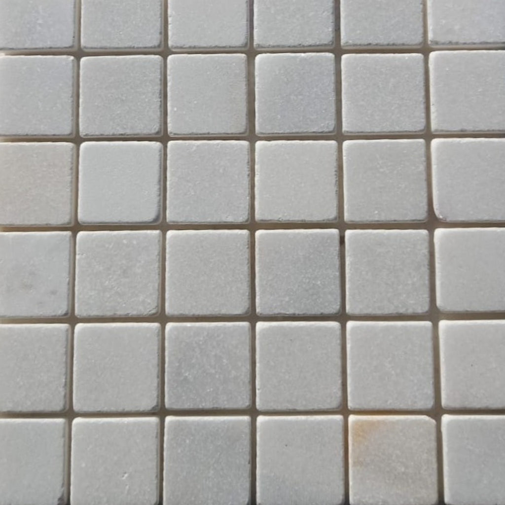 The BIANCO WHITE Squares 2"X2" on mesh 12"x12" Tumbled Mosaicmesh, offering a graceful blend of soft white tones with a textured finish.