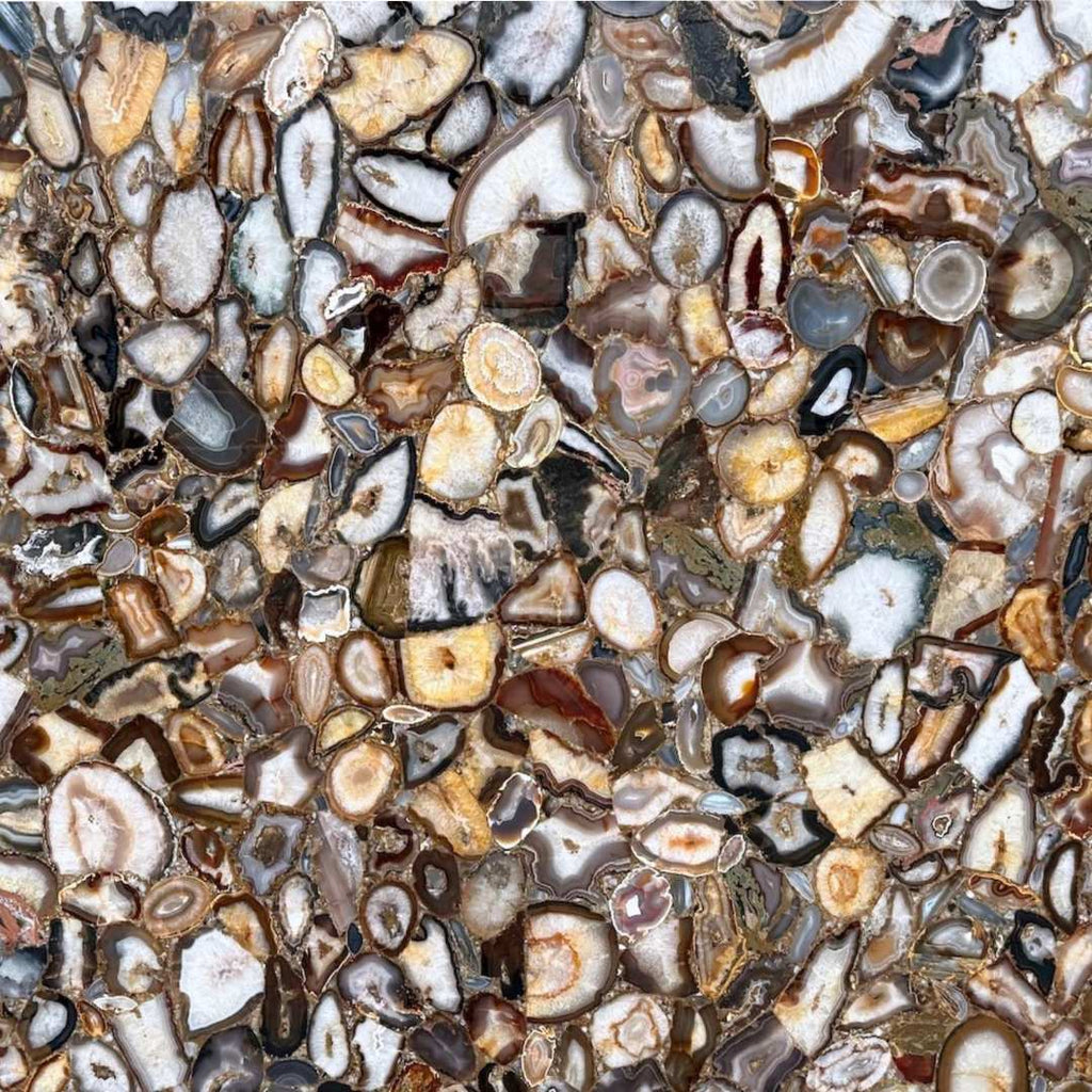 This striking semi-precious slab showcases an intricate mosaic of agate slices in warm shades of beige, honey, caramel, and soft gray. Each stone reveals its own natural rings and textures, and the subtle translucency adds depth and movement, creating an organic yet sophisticated visual effect that feels both luxurious and timeless.