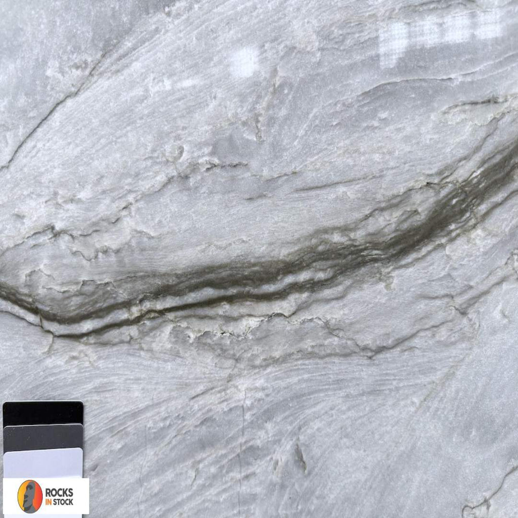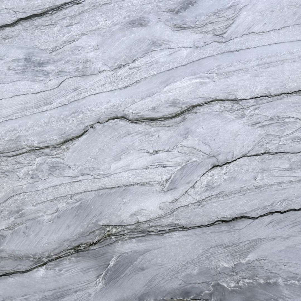 This quartzite slab features a fluid and elegant texture with soft shades of gray, white, and beige, interspersed with delicate veins that create a sense of movement and depth. Its natural hues and subtle shimmer lend a sophisticated look, perfect for spaces seeking a blend of modernity and natural beauty.
