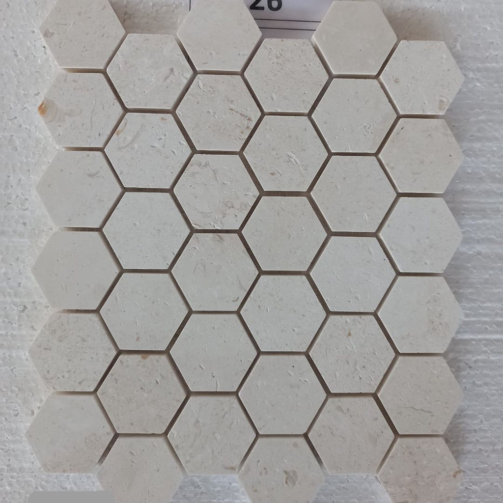 Elevate your space with the WHITE LIMESTONE Hexagon 12"x12" Honed Mosaic. This elegantly shaped mosaic offers a smooth, honed finish that enhances its natural limestone beauty while providing a subtle texture underfoot. Perfect for creating a timeless, sophisticated atmosphere, this durable tile is ideal for both walls and floors, combining distinctive style with easy maintenance. Transform any room with this versatile, high-quality choice that brings refined charm and lasting appeal.