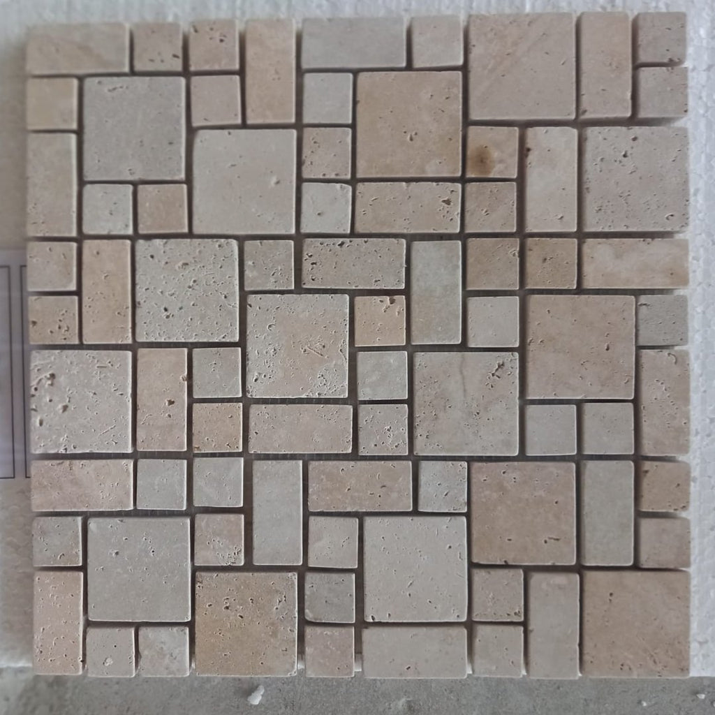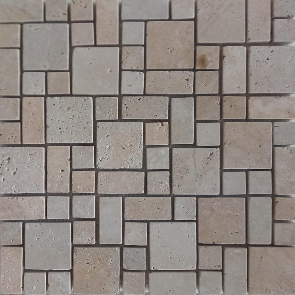 Enhance your interiors with the TUSCONY TRAVERTINE French 12"x12" Tumbled Mosaic. This mosaic showcases softly tumbled travertine tiles that bring a rustic, old-world charm to any space. Its natural texture and warm tones create an inviting atmosphere, ideal for floors, walls, or backsplashes. The 12"x12" mesh backing simplifies installation, ensuring a seamless and stylish finish. Durable and timeless, this mosaic is perfect for adding character and elegance to your home.